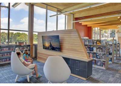 Sustainable elements include pervious parking surfaces, natural daylighting, low flow plumbing fixtures and renewable resource materials and finishes – resulting in a new Library which achieved LEED Silver equivalent – and provides strong environmental stewardship of the land and site where it has been built.