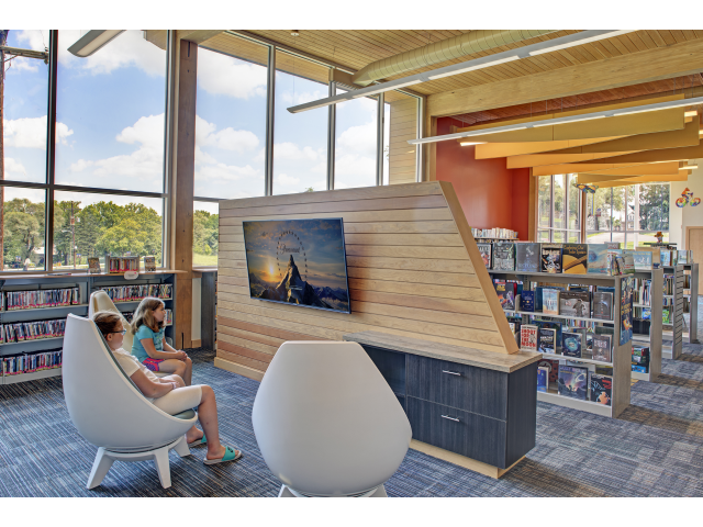 A heavy timber beam system and structural wood deck is exposed in the primary reading areas where clerestory natural daylighting is combined with direct daylight at the perimeter window walls of high performance glazing. The exterior materials include a combination of native stone, wood siding, wood panel products, and recycled metal – so that the total building
